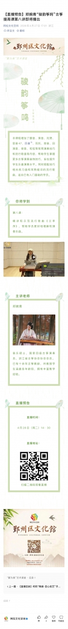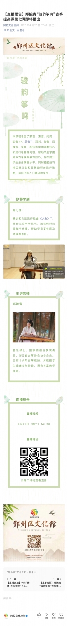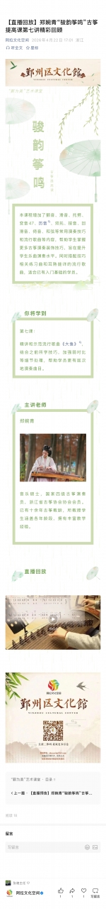 【直播预告】郑婉青“骏韵筝鸣”古筝提高课第八讲即将播出